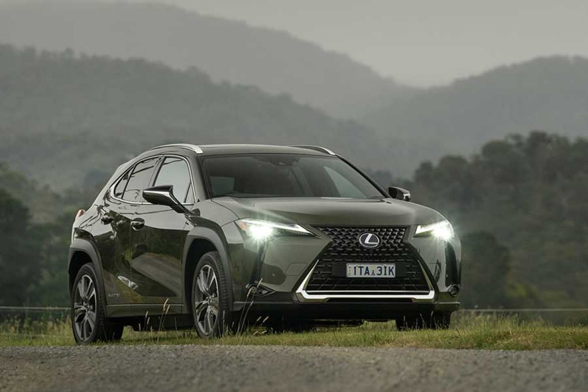Front side view of a silver Lexus RC350 F Sport Coupe car in motion on a country road
