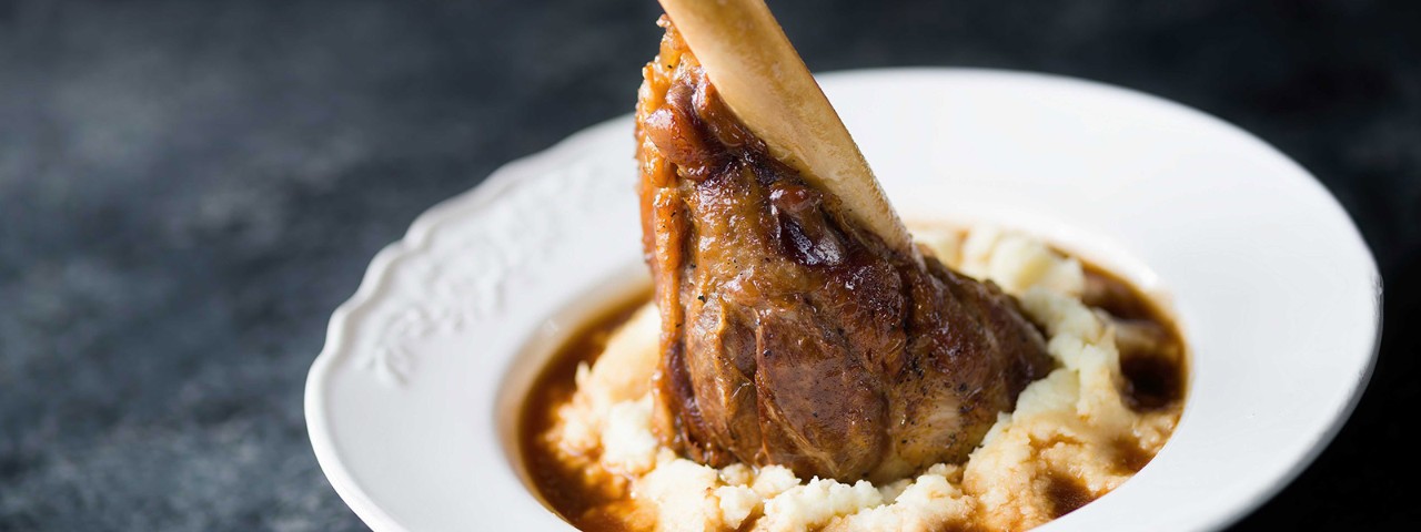 Slow-cooked lamb shanks in red wine sauce with creamy mash
