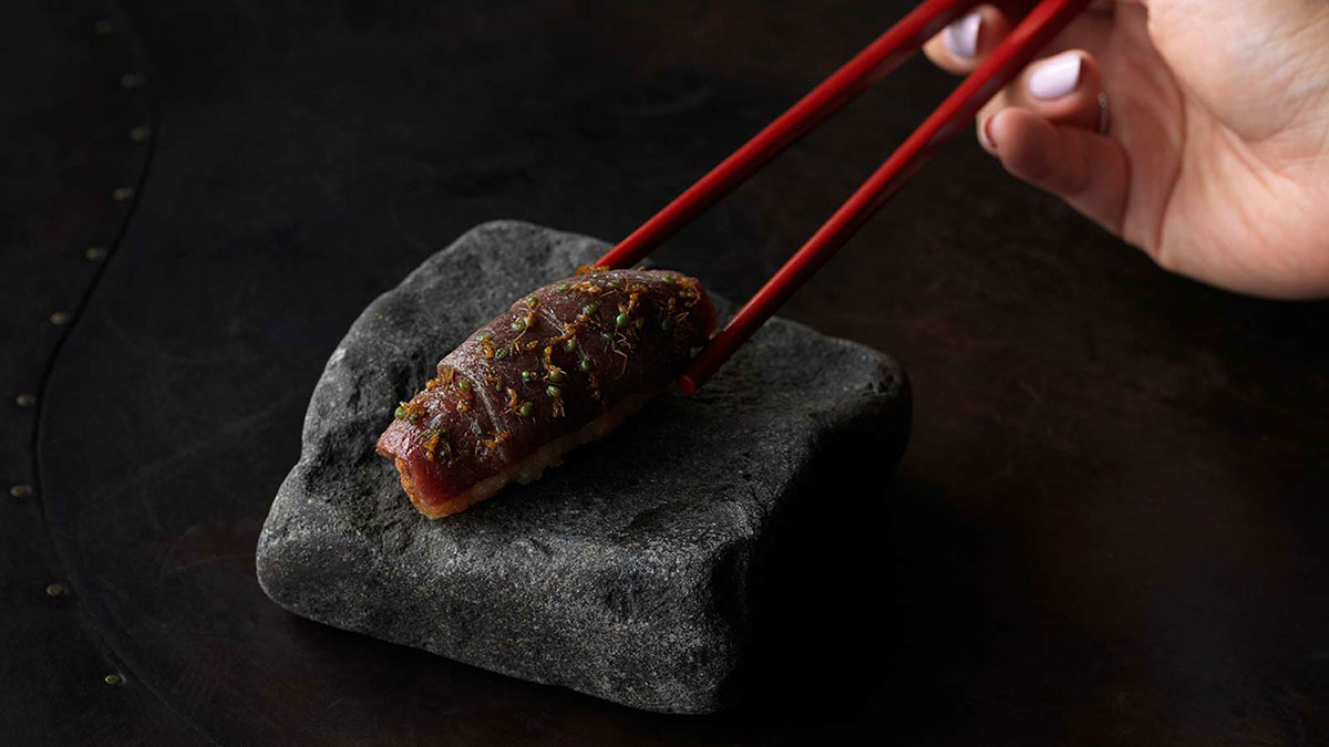 The cured kangaroo topped with green ants at Vue de Monde. Photo: Supplied.